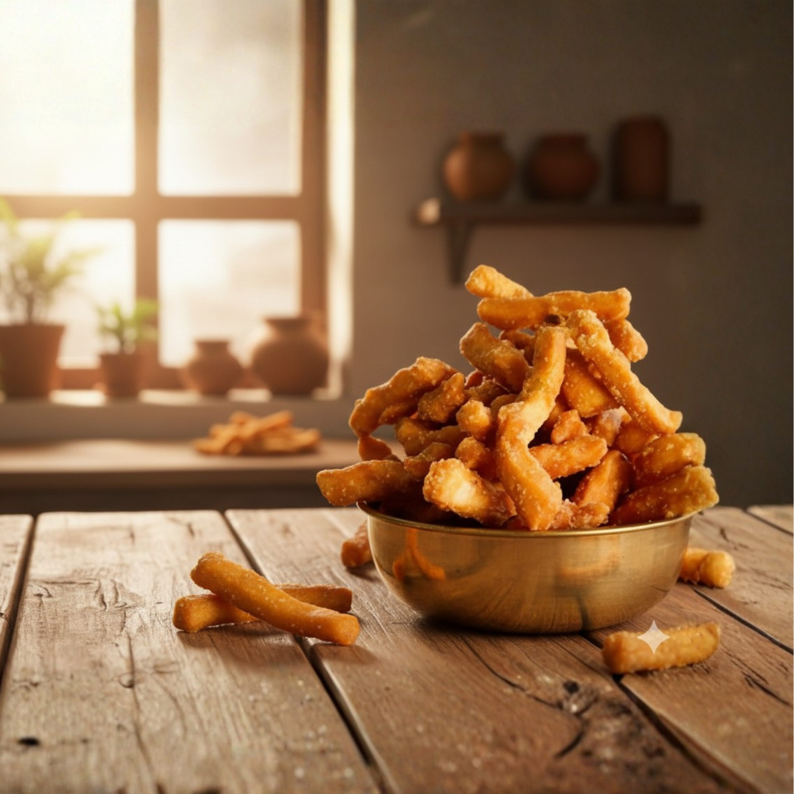 Traditional Bellam Kommulu made with crispy dough sticks coated in rich jaggery syrup. A crunchy and sweet festive snack with authentic taste.