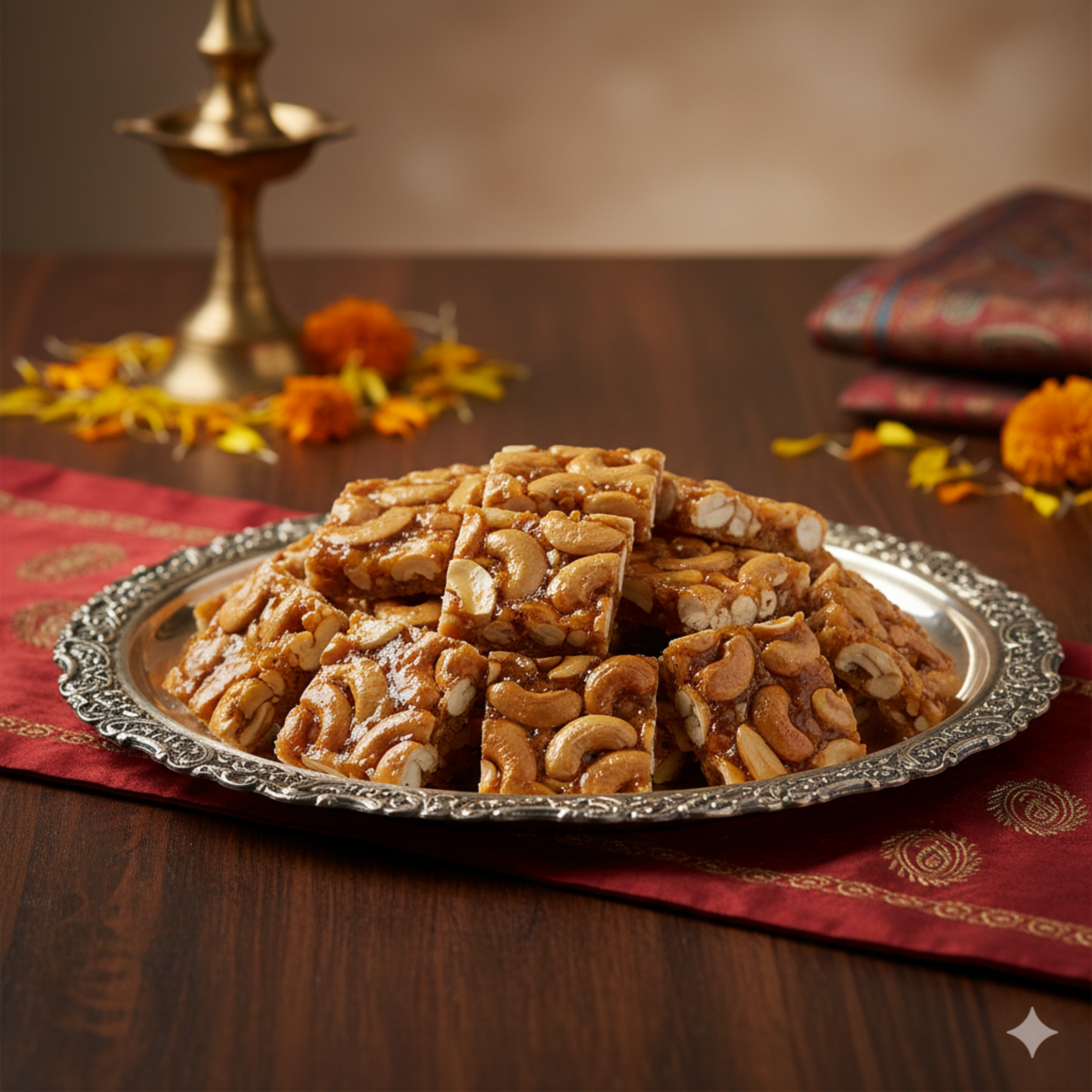 Enjoy the rich crunch of Cashew Chikki from Sai Ram Foods, a traditional Indian sweet made using high-quality cashew nuts and pure jaggery. Carefully cooked to achieve the perfect brittle texture, this chikki offers a delightful balance of nuttiness and natural sweetness. Ideal as a healthy snack or festive treat, Cashew Chikki is loved for its taste, energy, and traditional goodness. Each bite delivers freshness, crunch, and authentic flavor.